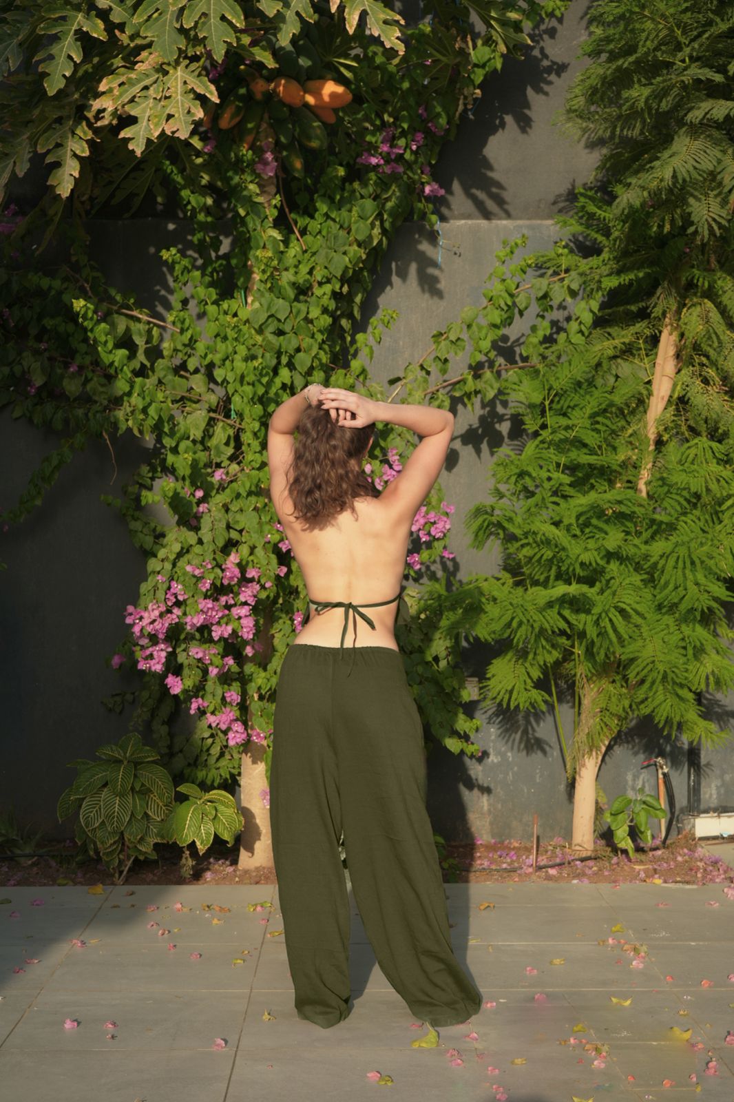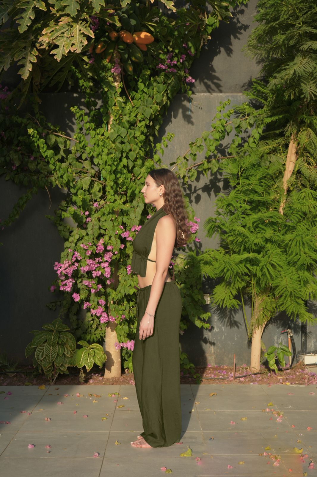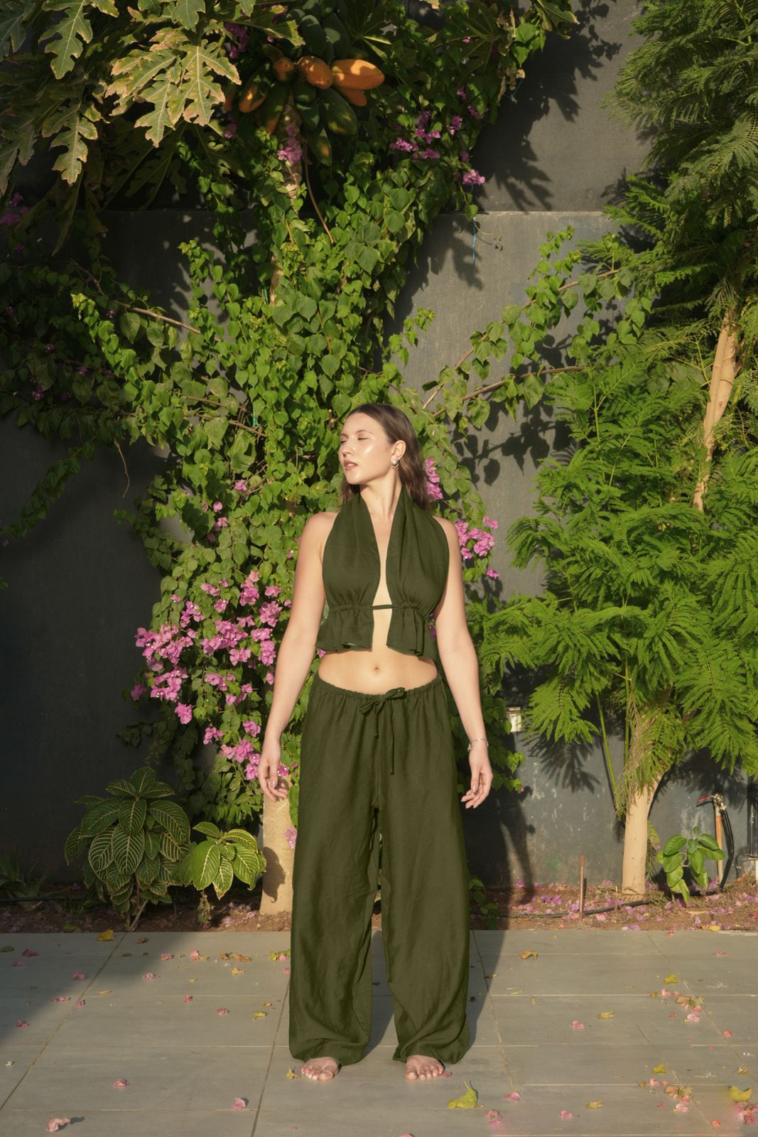 This Backless Pants Set combines sophisticated design with effortless comfort. Featuring low-waist linen pants paired with a halter-style neck top that reveals an open back, it offers a bold yet relaxed silhouette. Crafted for seamless day-to-night wear, this set is available in green, brown, beige, and black, allowing you to express versatile style with ease.